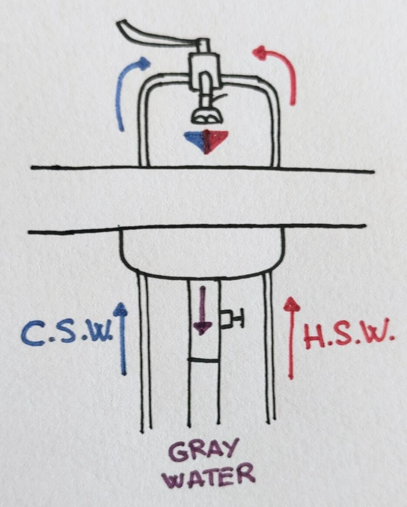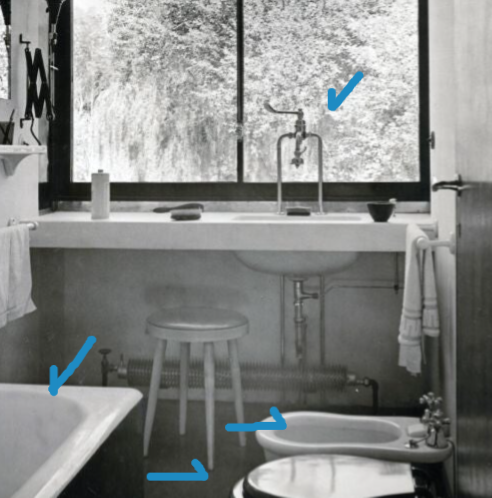 Taking a look at the original pictures and plans, we can make a guess of how the sanitary water installation would have been: