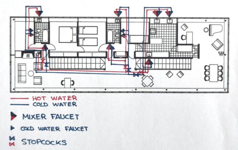 This plan is merely schematic to see how could the sanitary water installation could have worked. Hot and cold water pipes come to the house through the bracket to the installations room downstairs, where the water meter and boiler would have been installed. In the house, they navigate to the wet rooms through the closets walls (by the stairs) or under the floors. The same system would have been used to direct hot and cold water to the lower floor service bathroom, by directing the pipes through the first level floor slab, under the house's water installations, and then gets to the service bathroom through its downspout.