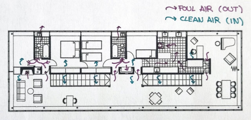 In the house's interior, there are air vents in the longitudinal wall in the middle of the floor plan that supply the stay rooms with fresh air, that move the foul air from them to the wet rooms, and then to the outside through the cooker hood in the kitchen or the windows in the bathrooms.