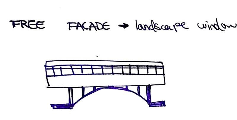 The arch is supported by vertical transverse ribs, also made of reinforced concrete, which work in compression and transmit the loads from the floor slab and the house to the arch.