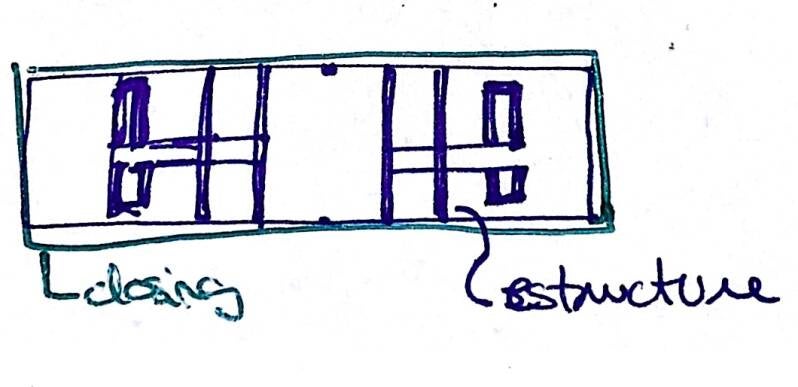 A longitudinal structural wall rises above the floor slab on the ground floor of the house, with openings for passageways and free areas. In turn, in the perimeter area of the house, detached from the façade, there are a series of piles which, together with the longitudinal wall, support the roof.