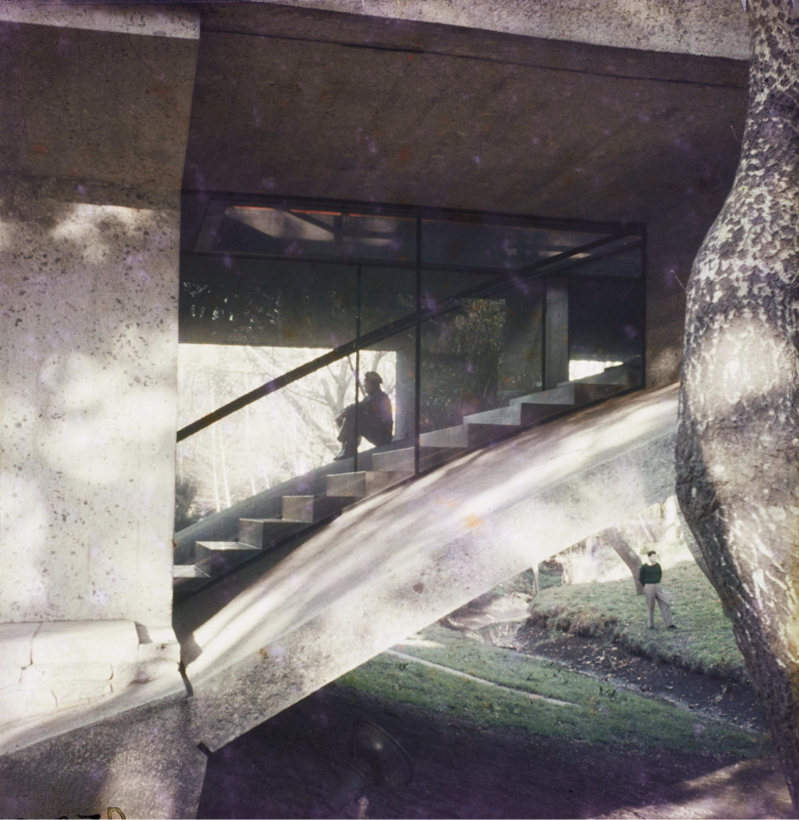 The structure supporting the house consists of a parabolic sheet of reinforced concrete in the shape of an arch, articulated at its supports and firmly anchored to the ground by means of a foundation made up of two enormous footings, one on each bank of the stream, which transmit the loads to the ground at an oblique angle.