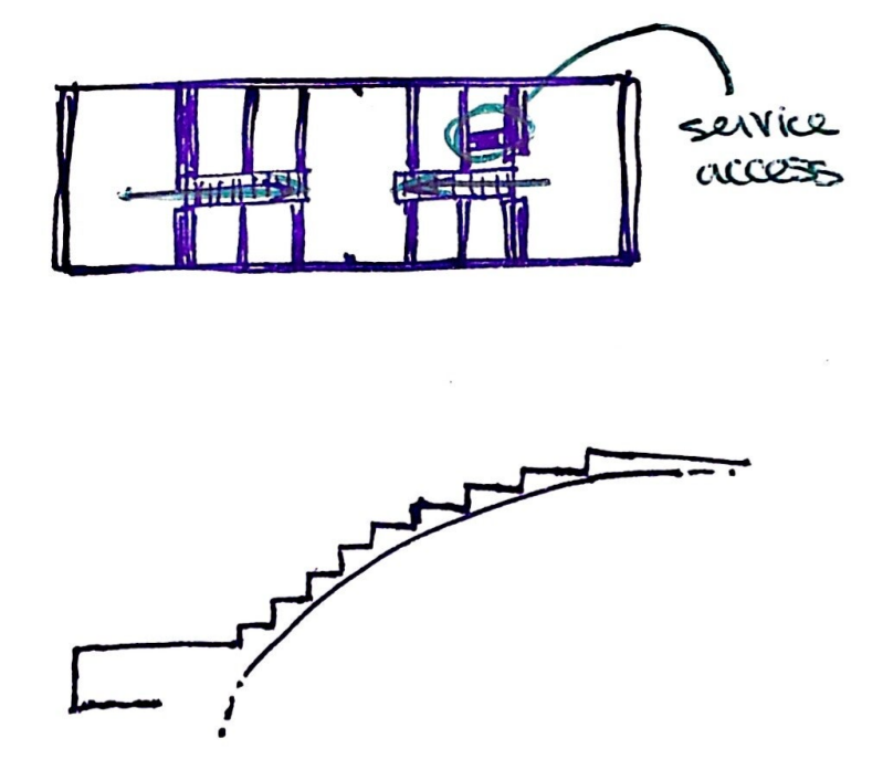 The main access to the house is via two staircases supported by the arch of the bridge structure. Both staircases lead to the centre of the floor of the house, but allow access to the house from either side of the stream. The tread of the steps is continuous, which means that the tread is of varying depth to match the curvature of the arch: